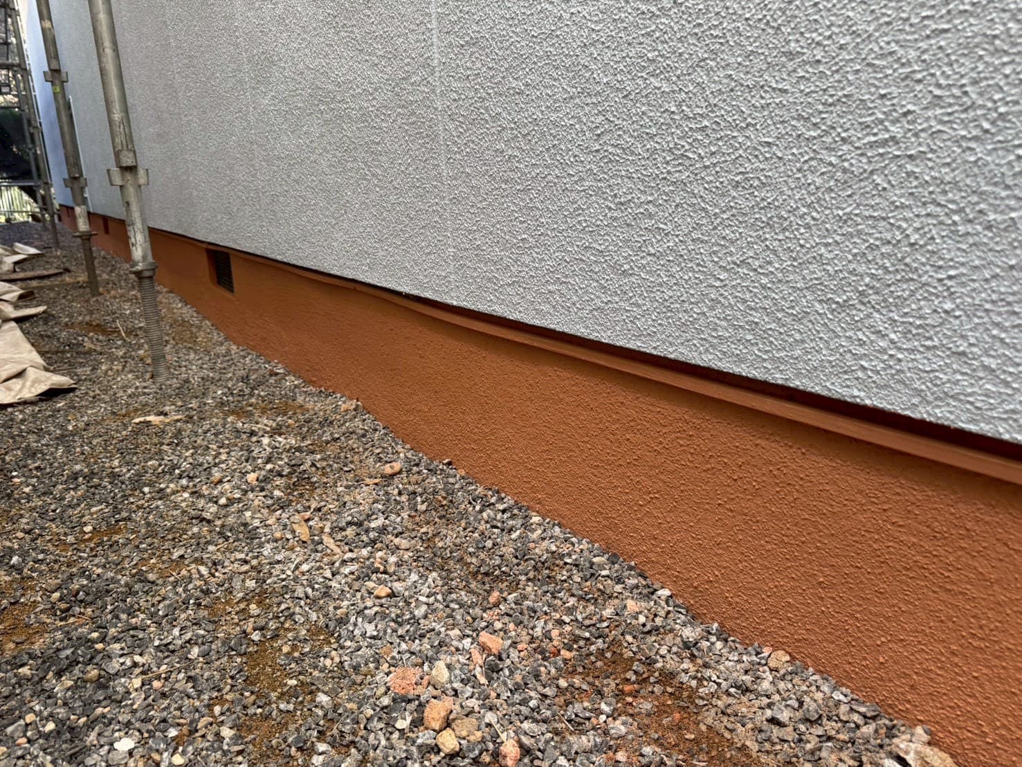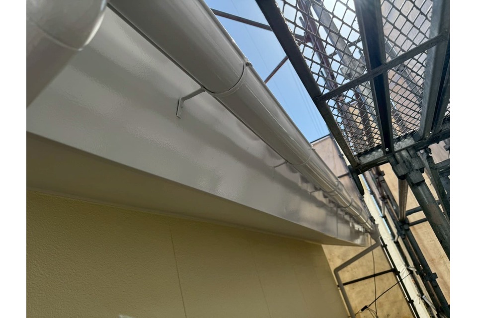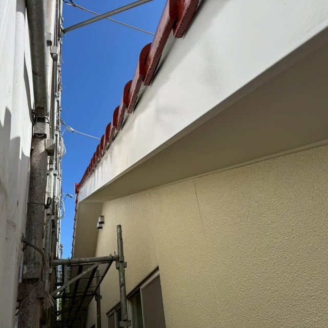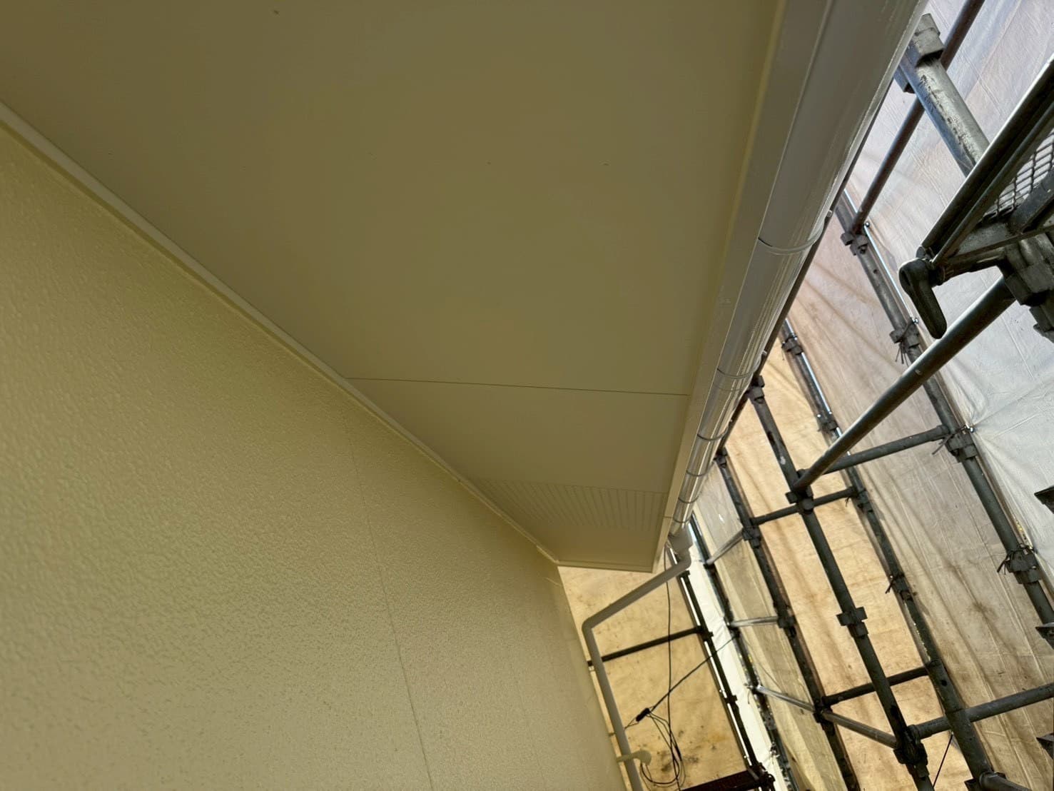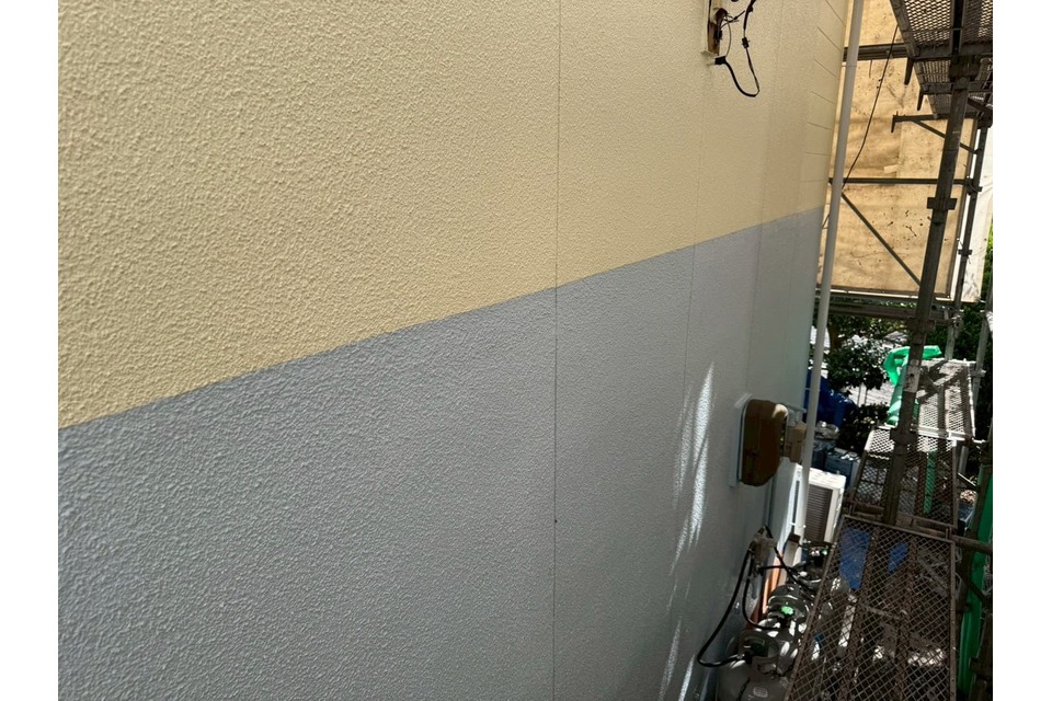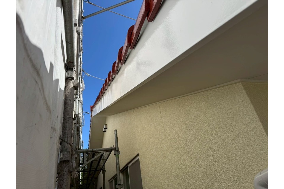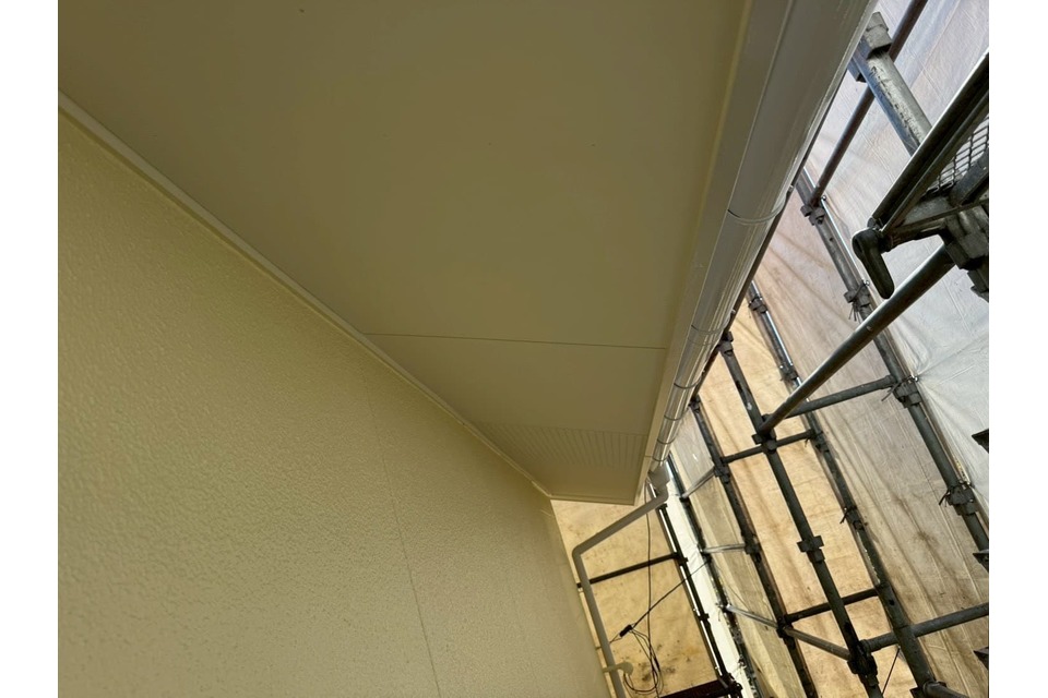 軒天やベランダの劣化が進んでいたため、軒天は大工工事後に塗装、ベランダは左官工事後に防水施工を実施し、下地からしっかりと補修しています。屋根・外壁ともに遮熱型無機塗料を使用し、超高耐久・超低汚染・遮熱効果を備えた長寿命仕様に。外壁はデザイン性にもこだわり、機能性と美観を両立した仕上がりとなりました。