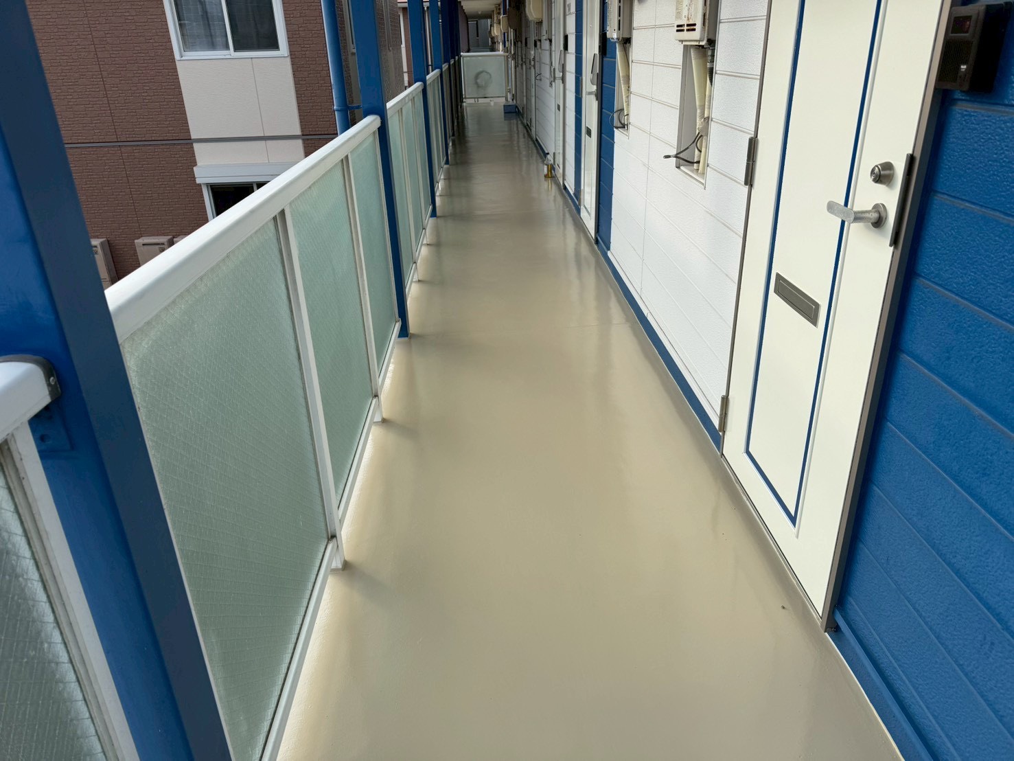岡山市中区竹田にて、K様邸の玄関ドア・廊下・鉄骨階段の塗装工事を行いました。建物全体の劣化が気になることに加え、「デザイン性を高めたい」とのご要望を受け、素材ごとに最適な施工を実施しています。玄関ドアや鉄骨階段にはハイグレードシリコン塗料、廊下のコンクリート面にはボウジンテックスを使用し、高耐久・低汚染性能を確保。機能性だけでなく、色味や質感にもこだわり、建物の印象を引き締めるデザイン性の高い仕上がりとなりました。